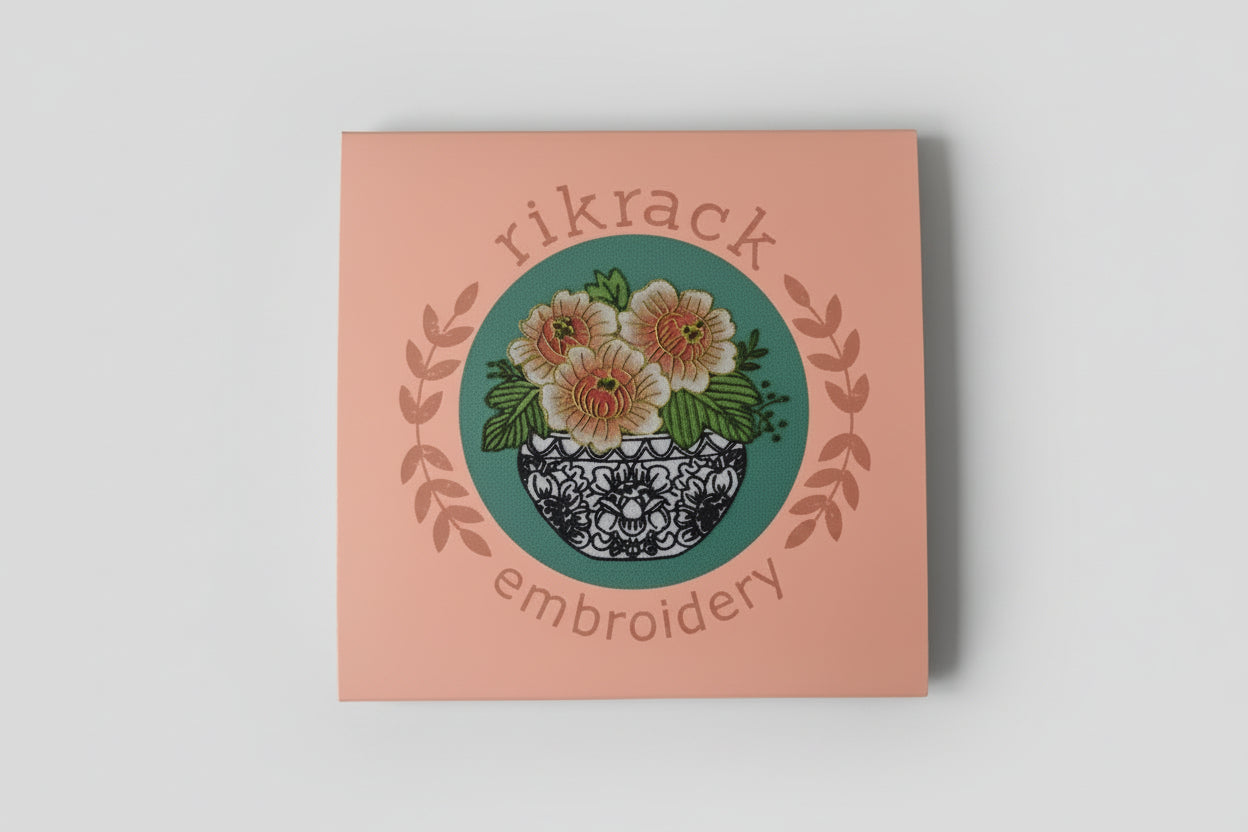 Rikrack's Peony embroidery kit has beautiful coral peony flowers in a blue and white patterned vase, perfect for flower lovers.