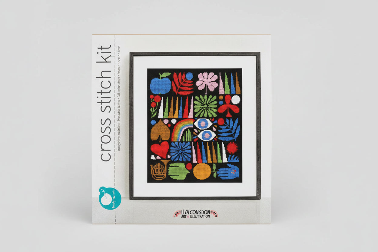 Based on the artwork of Lisa Congdon/Lisa Congdon Art & Illustration, the Joyful Grid Cross Stitch Kit invites you to stitch contemporary art with a striking twist. Set against a dramatic black backdrop, your vibrant stitches will absolutely sing, creating a stunning contrast that makes every colour pop. This geometric design celebrates clean lines and dynamic shapes with playful flair. The complete kit gives you everything needed to craft a gallery-worthy piece, whether you're a seasoned stitcher or picking up a needle for the first time.